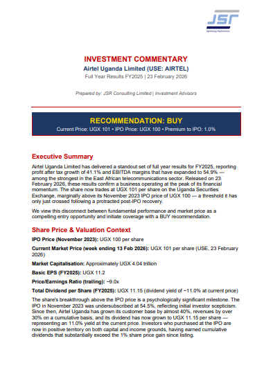 This commentary is prepared for informational purposes only and does not constitute financial advice. Investment in securities involves risk, including possible loss of principal. Past performance is not indicative of future results. Investors should conduct their own due diligence and, where appropriate, seek independent financial advice before making investment decisions. The analyst preparing this report may hold positions in the securities discussed. All financial data is sourced from Airtel Uganda’s audited FY2025 financial statements and publicly available market data. Share price data referenced is as at 23 February 2026 and may have changed by the date of reading.